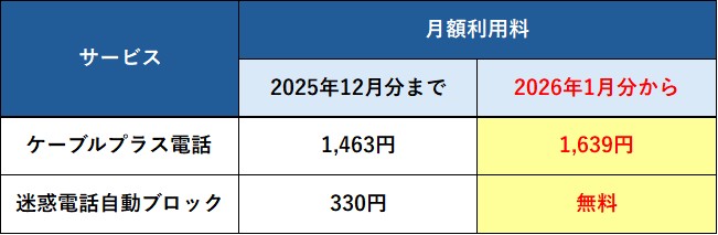 2026年1月1日より、ケーブルプラス電話のサービス提供元であるJCOM株式会社による改定に基づき、ケーブルプラス電話および迷惑電話自動ブロックオプションの月額利用料とサービス内容の改定をお知らせいたします。